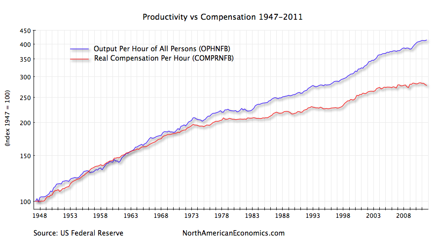 Between 1947 and the early 1970’s, worker compensation kept pace with increases in productivity. Beginning in the 1970’s, however, the average worker began to fall behind. The latest figures show that worker compensation is now 33% lower than it would have been – had it kept pace with productivity. Where did that 33% go?