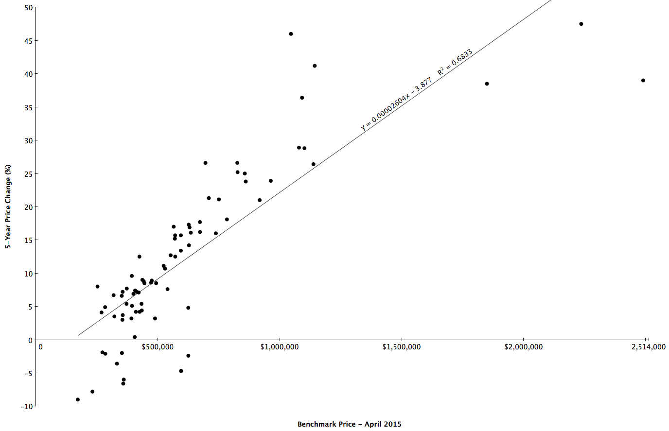 I then created the same plot using data from the most recent Stats Package, and the results are pretty startling. High-priced homes have appreciated much more than less expensive properties over the last 5 years.