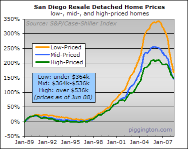 But after years of listening to claims that foreign buying is too insignificant to drive a market as big as Vancouver, I think I’ve found definitive proof. When housing markets are driven by easy financing and low mortgage rates, appreciation is higher for low-end, entry-level homes than it is for more expensive homes. Entry-level buyers are much more likely to max-out on debt than older, wealthier homeowners. This was the case in US bubble markets. For example, look at San Diego. Low-priced homes increased much more than high-priced properties.